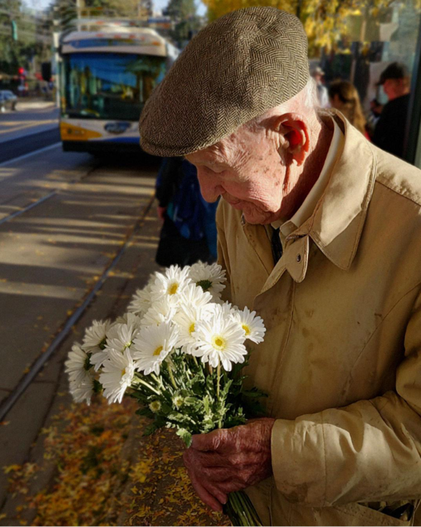The sky was a heavy gray, impossible to tell whether it would rain or just remain overcast and indecisive all day.Then I saw him.An older man stood at the curb, slightly hunched, holding a small bouquet of daisies wrapped in clear plastic.