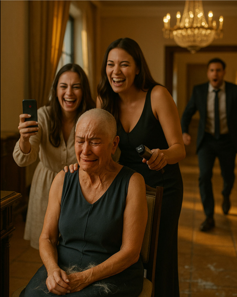 Aunt Amália turned slowly. Karina stared at the clippers in her hand, wide-eyed. The door opened fully, and Rodrigo Mendoza, her son, stood there. His eyes swept over the scene: the hair strewn on the floor, the phone recording, his wife posing with the clippers, and his mother, standing with serene dignity, her gaze commanding everything.