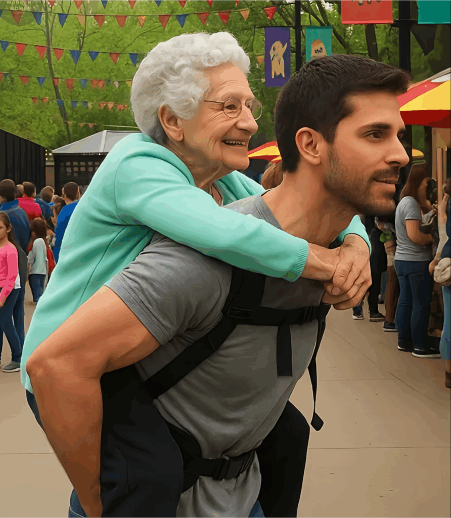 Sometimes, love is a strong back, steady arms, and the will to climb one step at a time.And wherever Linda longs to go—through city streets, along mountain trails, or into the heart of a bustling festival—Michael is there, strap in hand, ready to lift her with patience and gentleness.