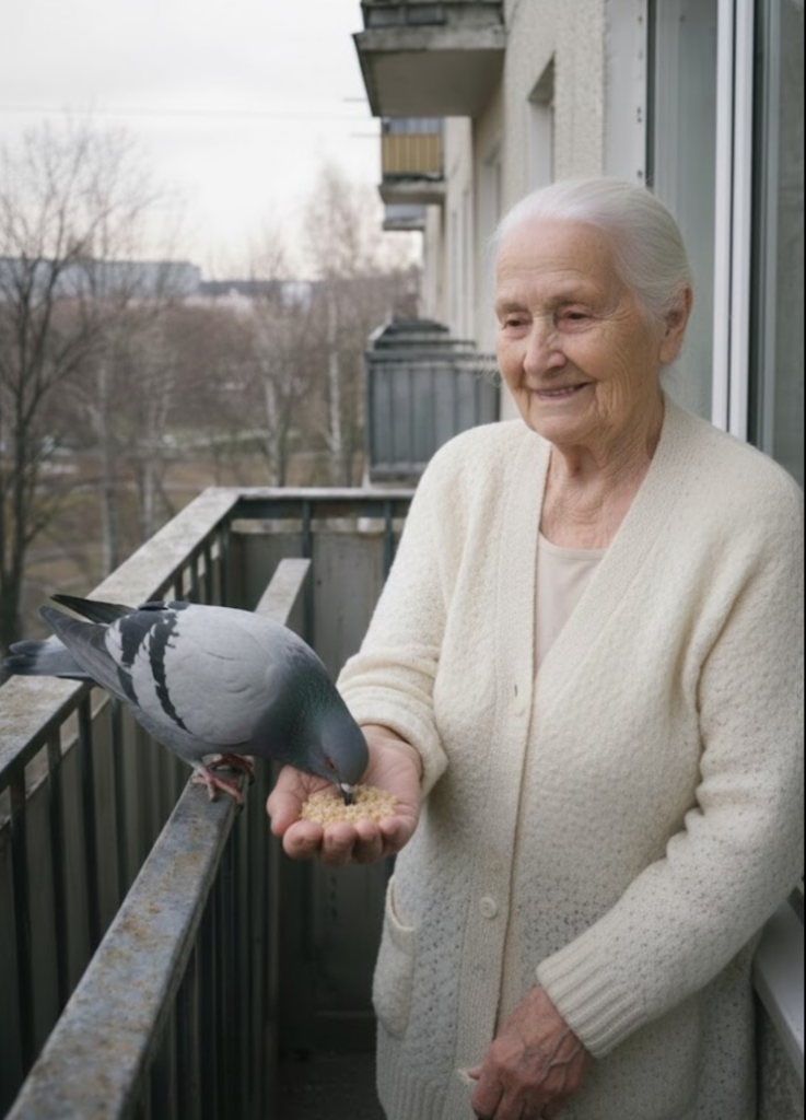 Every morning, the same step onto the balcony, the same hand movement, the same silence.Until a neighbor spoke, his voice heavy with guilt:— The pigeon… a car hit it. I thought you should know.She thanked him calmly and returned inside. Her morning suddenly felt empty.