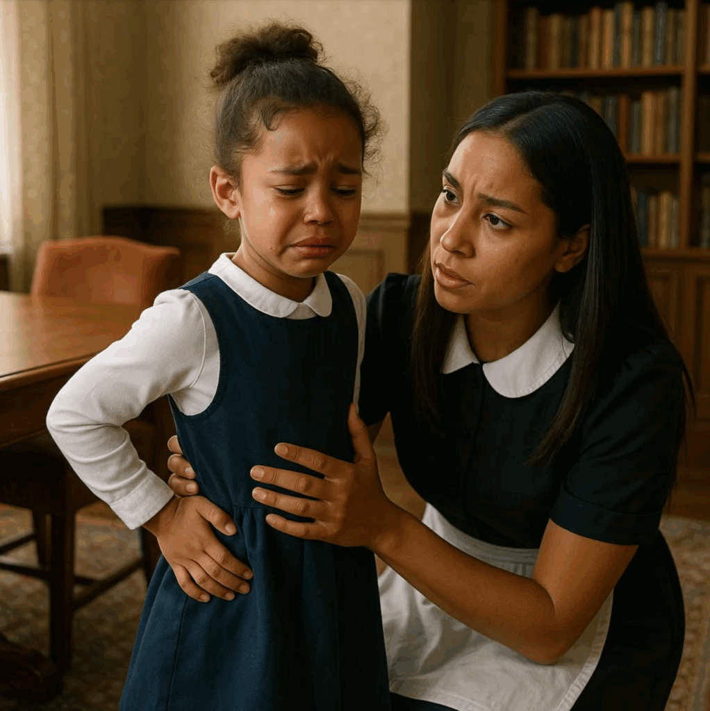 “Where does it hurt?” she asked, her voice unsteady.The girl clutched her lower back, tears streaming freely. “Daddy said it wouldn’t hurt…” she whispered again, her words trembling with pain. The maid’s heart clenched. Sharp as a knife, the truth cut through her mind.