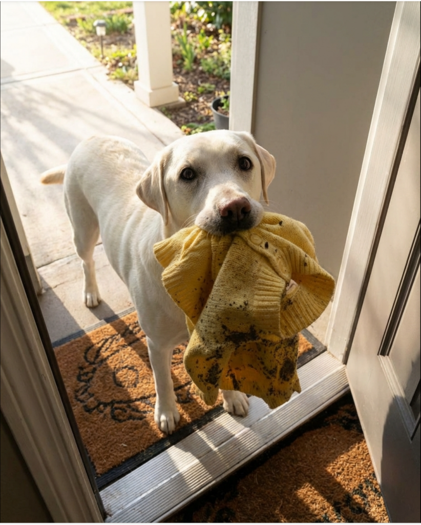 This was desperation. I opened the door, already irritated, already exhausted—and then my heart stopped. Baxter stood there, tail rigid, eyes locked on mine. In his mouth, gently clenched between his teeth, was Lily’s yellow sweater. The one with the tiny embroidered sun near the sleeve.