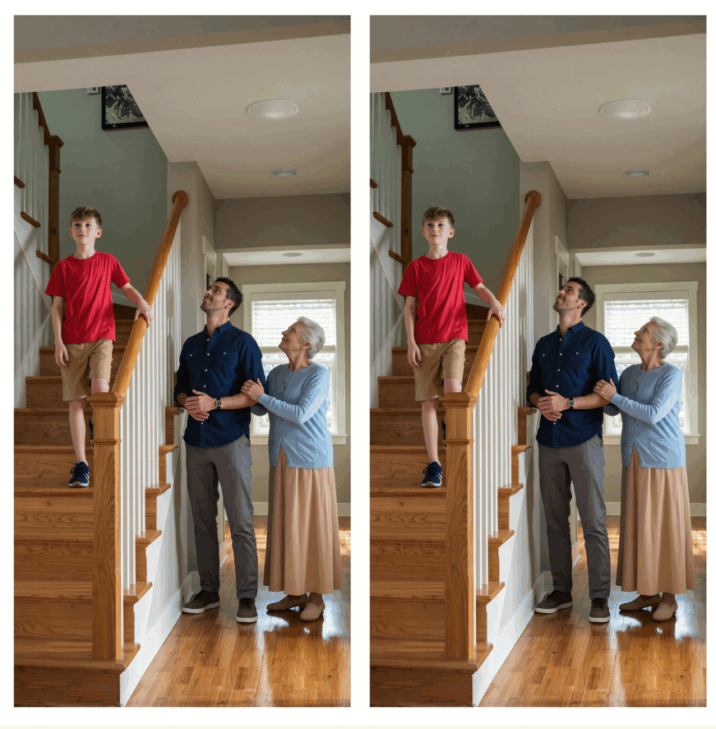 There was Leo—bright red T-shirt, soft slippers, carefully holding the railing as he descended the stairs, humming to himself. He wasn’t running. He wasn’t careless.Lie number one shattered.