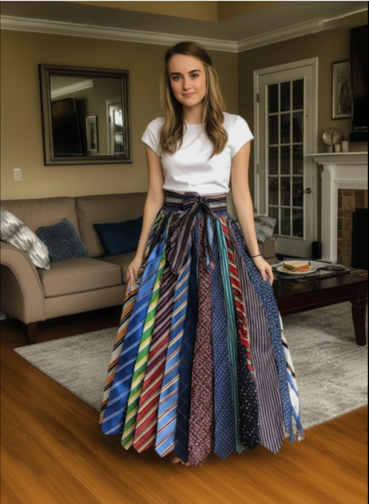 I taught myself to sew.Night after night, I stitched, unraveled, stitched again. Slowly, painfully, the ties became a skirt. Every tie held a memory: the paisley one from his big job interview, the navy one he wore to my middle school recital, the absurd guitar-print tie he wore each Christmas morning while baking cinnamon rolls.