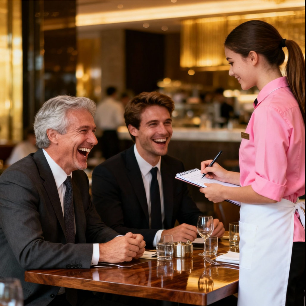 In the luxurious restaurant L’Étoile Dorée, Elena moved with silent elegance, like a light shadow among the sparkling tables. The guests—rich and powerful—often passed by without noticing her, absorbed in their conversations and laughter, oblivious to the young waitress’s discreet presence.